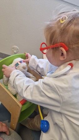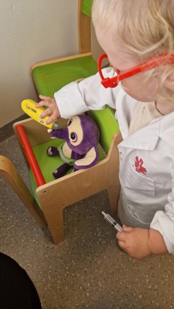 Hver HMS uke har vi også bamsedoktor. Alle barn får ta med seg en bamse hver, og avdelingene steller i stand til doktorlek sammen med bamsene. Bamsene blir lyttet på, tatt prøver av, gitt medisin og får plaster. Det er godt de har så gode eiere som koser og passer godt på dem :)
