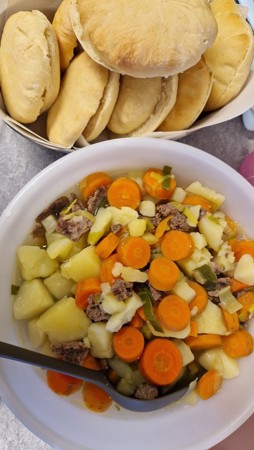 Til lunsj hadde Klaudia laget den samiske nasjonalretten Bidos til oss, som inneholder reinsdyrkjøtt, potet, gulrot og løk. Det var spennende smaker.