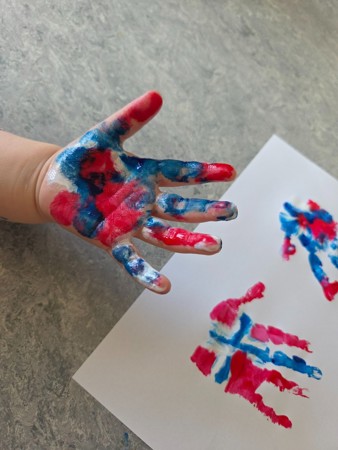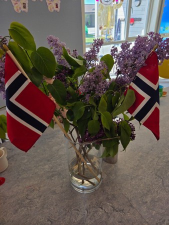 Våren er i full sving i barnehagen og 17. mai er en stor dag for store og små. Vi har brukt store deler av mai til å forberede oss. Vi har laget mye kunst og pynt, brukt hendene våre og malt både kongler og pinner! Vi har også øvd masse på alle sangene vi synger i toget.