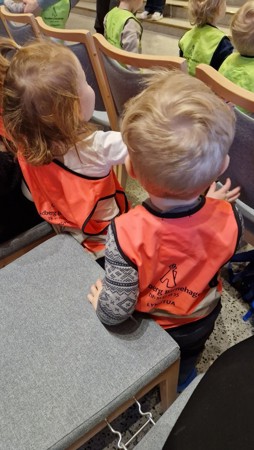 Vi har vært i kirka på forskjellige dager. Vi tok rutebuss til kirken og gikk gjennom kulturhuset på veien til kirka. Der hadde de pyntet til jul med flotte lys, juletrær og rød løper, det var stas. Da vi kom til kirka, fikk vi høre juleevangeliet og se Jesus-barnet i krybben.