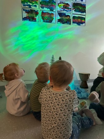 I forkant av dagen har vi fargelagt samenesflagg i flotte farger. Vi har også hatt fokus på nordlyset. Vi har brukt prosjektorer, sett på videoer av hvordan det ser ut, så har vi på forskjellige måter laget vårt eget nordlys her i barnehagen. Noen hadde maling på ett ark i nordlysets farger med plastfolie over, så skjevlet barna ut fargene som laget et nydelig kunstverk. Andre hadde ett suuperlangt ark hvor alle barna tegnet nordlys imens de så på video av hvordan det ser ut. Noen av oss har også laget lavvoer av ispinner og silkepapir.
