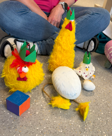 Vi har fortalt eventyret om ‘’kyllingene som kjempet om å få det fineste påskeegget’’, vi har sunget ‘’en liten kylling i egget lå’’ og ‘’haren uti gresset. ‘’ Barna syntes det var skikkelig gøy å kose med den lille kyllingen som spratt ut av egget 😊