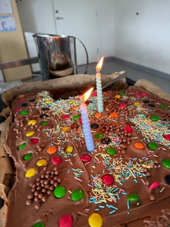 Det var mange spente barn som kom i barnehagen på morgenen. Alle hadde finstasen på og var klare for fest! Hver avdeling hadde fått oppsatser av ballonger som selvsagt tok barnas oppmerksomhet når de kom inn døra, men noen var også opptatt av at i dag skulle vi ha kake i barnehagen!?!?